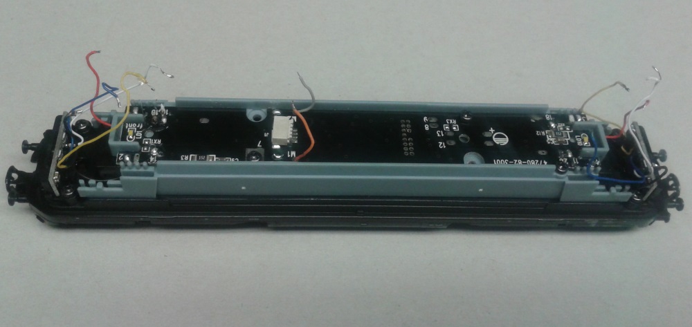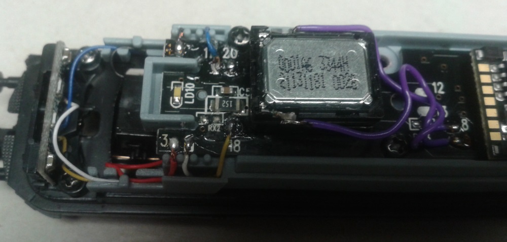 Der Lautsprecher muss ähnlich wie der der BR 130 gekürzt werden, dann passt alles anstandslos unter das Lok Gehäuse. Die notwendigen Kabelanschlüsse können an vorhandene Lötpads 8 & 9 gelötet werden, auf den Fotos ist dies deutlich erkennbar. Für die Rücklichttrennung müssen leider auch noch zwei gelbe Kabel um gelötet werden, hätte man bei einer PLUX16 eigentlich besser machen können. Ist aber nun wie es ist.