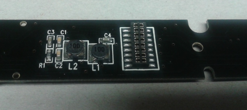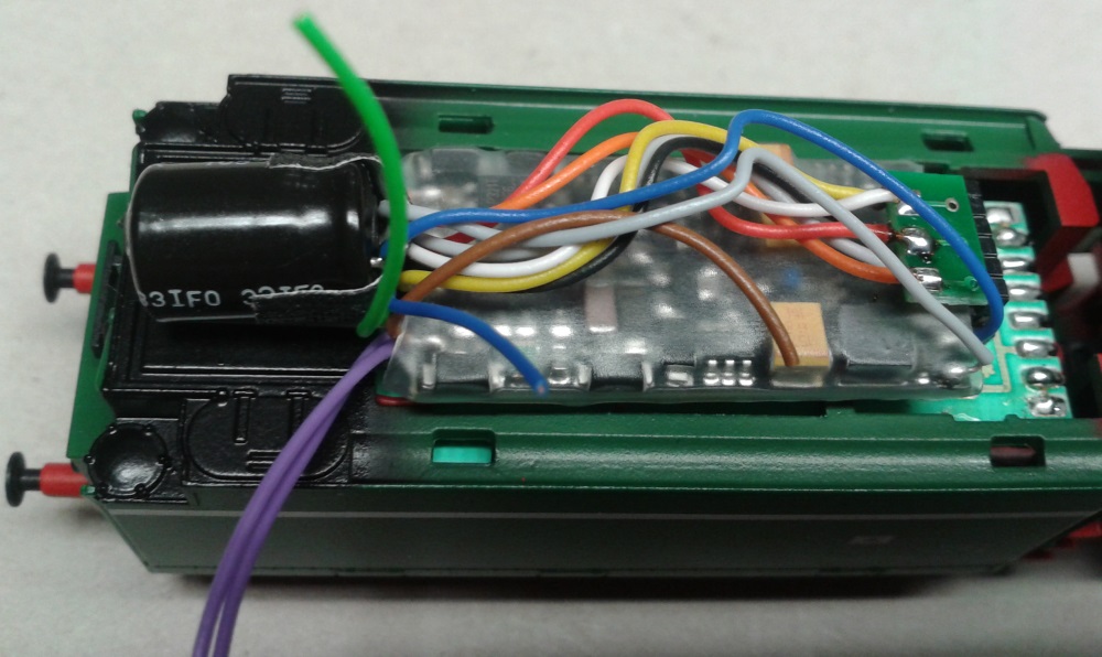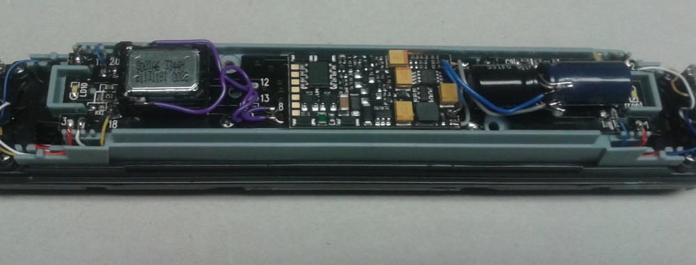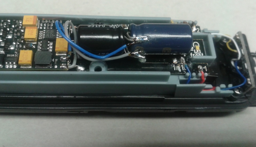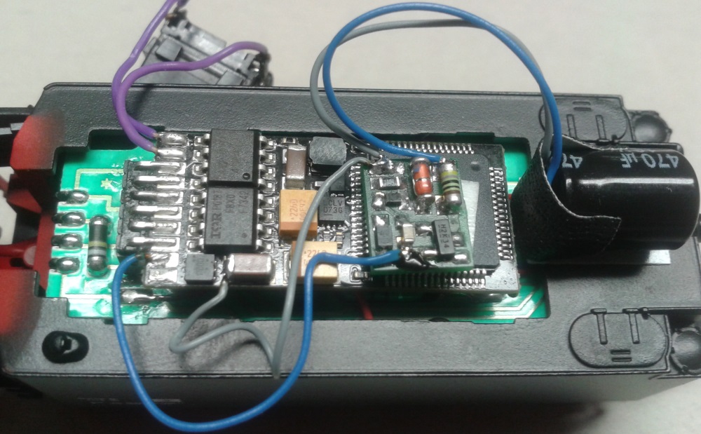 Die zwei kleinen Elko 470ueF16V und ein 680ueF/16V ( Parallelschaltung ) dienen als Energiespeicher, und verbessern dadurch die Langsam Fahreigenschaften und überbrücken kleine Spannungsaussetzer. Anschluss hierfür direkt am Decoder weil die Elko selber auf den erforderlichen Pads liegen.
